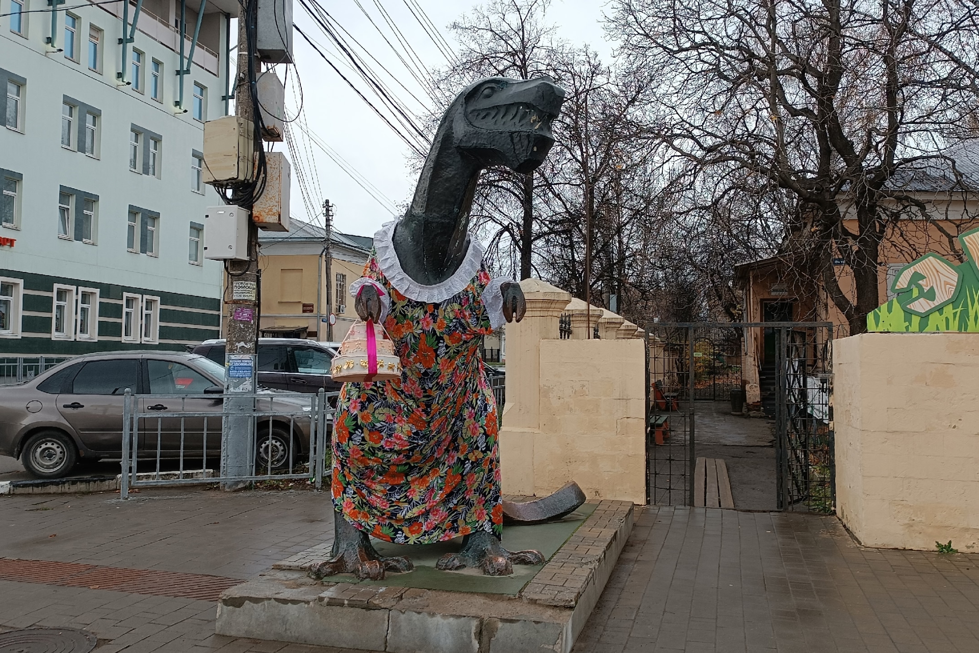 Однажды на 8 марта кто-то из горожан в шутку закрепил в лапе тираннозавра букет. Именно так родилась традиция наряжать Тещу на разные праздники.