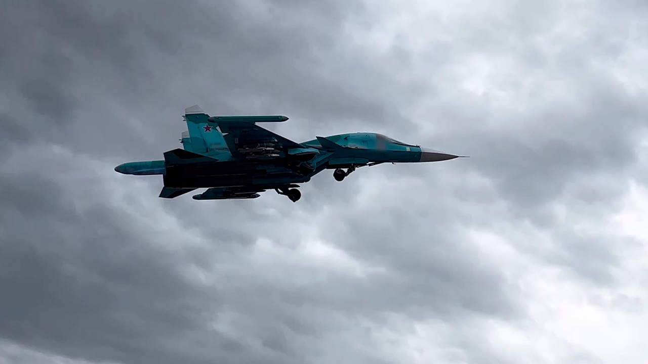 Минобороны России показало кадры боевой работы многофункционального сверхзвукового истребителя-бомбардировщика Су-34, экипаж которого нанес удар по складу боеприпасов и беспилотников ВСУ в зоне ответственности группировки войск «Восток». На видео запечатлена подготовка самолета к вылету: под крылом подвешены авиабомбы с универсальными модулями планирования и коррекции (УМПК). Далее показан сам Су-34 на рулежке и взлет с аэродрома. В кабине экипажа виден пилот в защитном шлеме и кислородной маске, выполняющий полетное задание. Камеры фиксируют момент отделения управляемых авиабомб — боеприпасы уходят вниз по заданной траектории после сброса. Завершающие кадры демонстрируют возвращение самолета на аэродром и посадку после выполнения задачи. Разведка подтвердила уничтожение цели, после чего экипаж благополучно вернулся на базу. Материал подготовили Андрей Аркадьев и Николай Баранов.