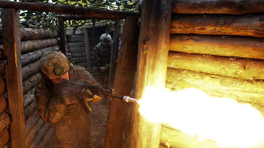 — Принял! — отвечает курсант с позывным Малой. После броска гранаты группа из трех бойцов прыгает в окоп, где начинают раздаваться выстрелы и взрывы. Штурмовики зацепись за траншеи и начали брать блиндажи.