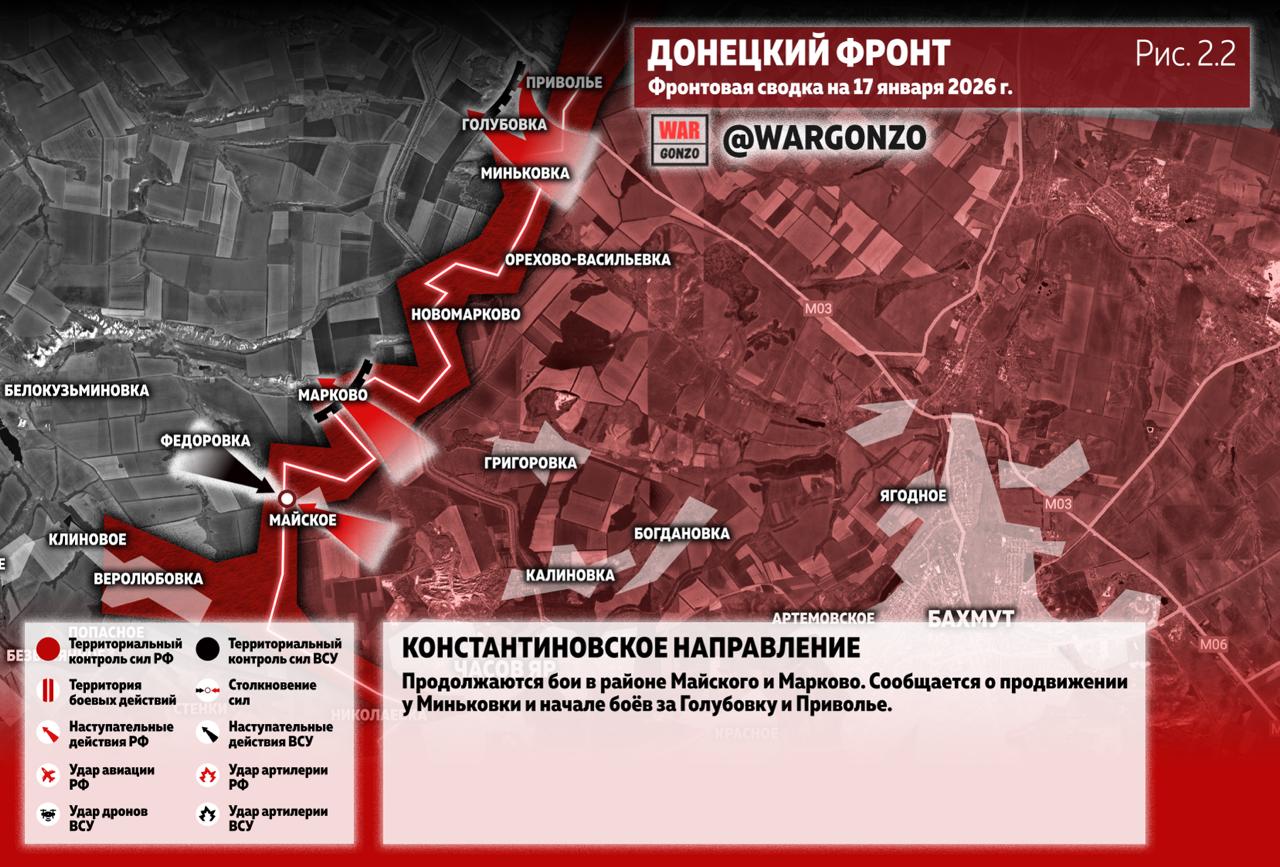 На Константиновском направлении продолжаются бои в районе Майского и Марково. Сообщается о продвижении у Миньковки и начале боёв за Голубовку и Приволье.