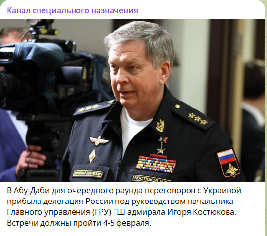 В ночь с 3 на 4 февраля стало известно, что наша делегация прибыла в ОАЭ на новый переговорный раунд, в котором также примут участие США и Украина. Россию вновь представляет глава ГРУ адмирал Игорь Костюков.