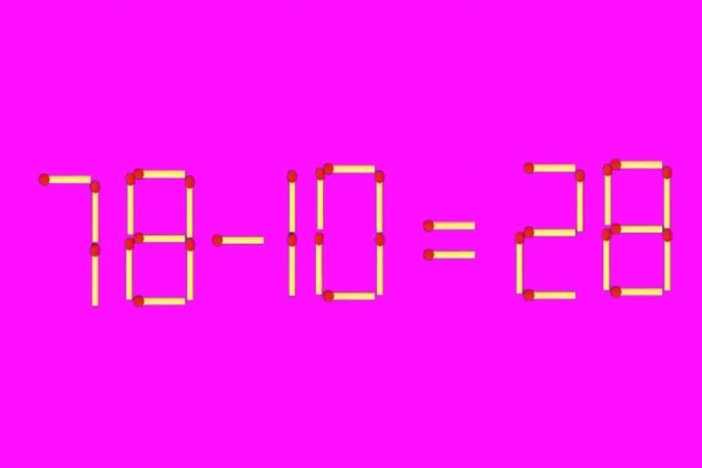 Давайте разбираться. Снимите горизонтальную перекладину с семерки в числе «78», она легко превращается в единицу. Тогда получается «18». А теперь самое интересное: минус тоже можно исправить, если добавить эту спичку. И вуаля — у нас выходит «18 + 10 = 28». Идеально! Никто и не сомневался.