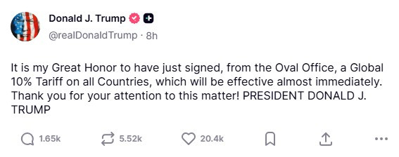 В своей соцсети Truth Social он объявил о подписании указа, подчеркнув, что он вступит в силу почти немедленно. По данным Белого дома, это произойдет 25 февраля, действовать пошлины будут 150 дней.
