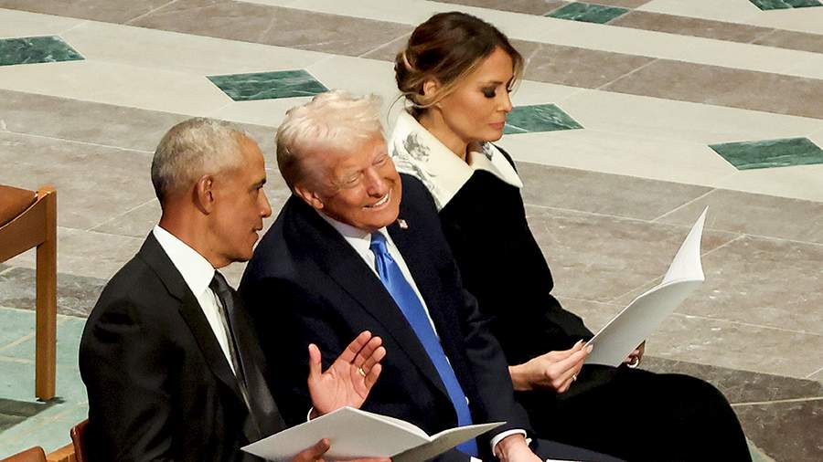 В книге, которая есть в распоряжении РБК, указано, что перед началом панихиды Трамп и Обама непринужденно беседовали, активно жестикулируя и улыбаясь.