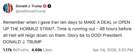 В своем микроблоге в Truth Social глава Белого дома напомнил, что «дал Ирану десять дней», чтобы заключить сделку с Вашингтоном или открыть Ормузский пролив.