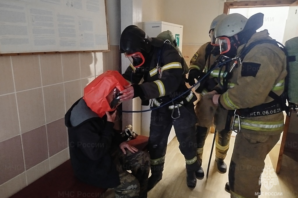 Согласно легенде учений, пожар из-за короткого замыкания произошел в комнате дежурного персонала на первом этаже, после чего огонь начал распространяться по помещению и возникла угроза его перехода на коридор.
