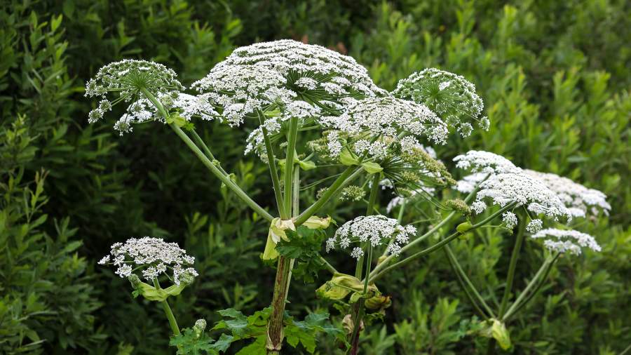 • Борщевик представляет собой одно из самых агрессивных и быстро распространяющихся растений. Его главная опасность заключается в соке, который содержит фуранокумарины. Это вещества, повышающие чувствительность кожи к ультрафиолетовому излучению. При попадании сока на кожу и последующем воздействии солнечного света возникают тяжелые ожоги. Они сопровождаются пузырями, болью и длительным заживлением, а на месте поражения могут оставаться пигментные пятна и рубцы. В некоторых случаях при обширных поражениях возможны осложнения в виде лихорадки и интоксикации организма.