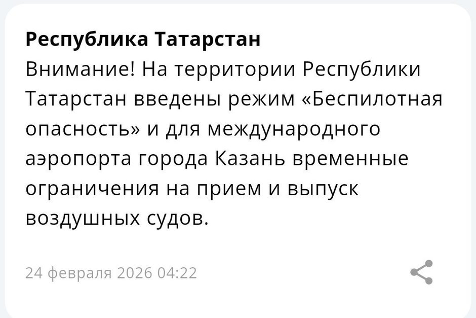 Также временно закрыт аэропорт Казани для приема и выпуска воздушных судов На территории Татарстана с 4.22 по московскому времени объявлен режим «Беспилотная опасность». Подобные ограничения в республике вводятся пятый день подряд. Также временно закрыт аэропорт Казани для приема и выпуска воздушных судов, сообщает Росавиация. Режим «Беспилотная опасность» объявлялся по Татарстану ежедневно, начиная с 20 февраля. В ночь на понедельник над территорией республики было сбито три вражеских беспилотника.