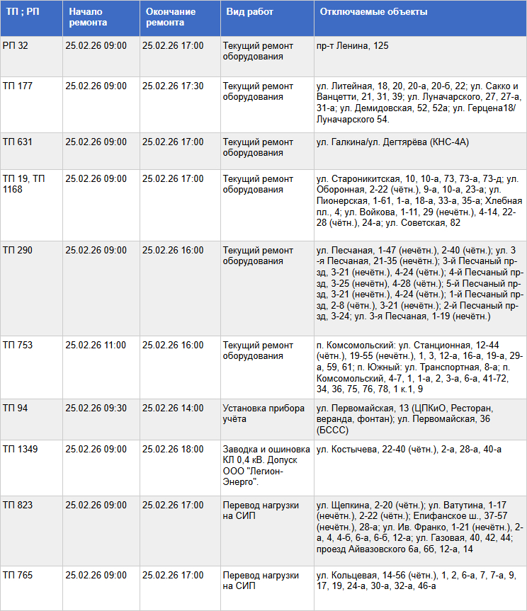 В частности, специалисты ресурсоснабжающей организации будут проводить в этот день текущий ремонт оборудования, установку приборов учёта, перевод нагрузки на СИП.