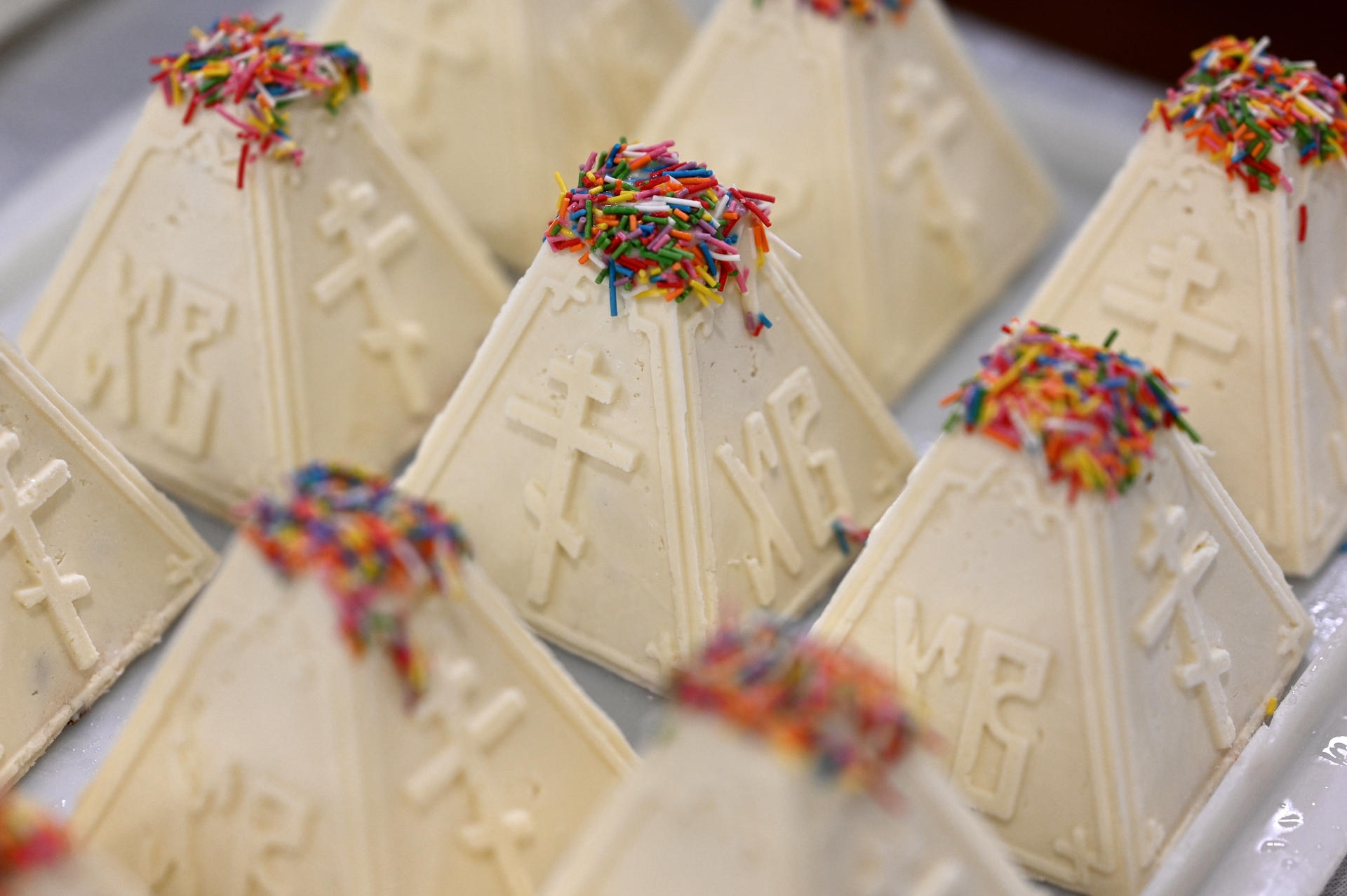 Творожная пасхаРИА Новости Сергей ПивоваровВ XIX веке закрепилась традиция готовить десерт в форме усечённой пирамиды. Она символизирует Голгофу и Горнее место, храмовый Божий престол. Для изготовления десерта делали деревянные, в частности липовые, формы — пасочницы. Блюдо могло быть украшено символами: изображениями креста, лестницы, копья, ветвей, цветов, яиц, колосьев, а также буквами «ХВ» — Христос Воскрес.