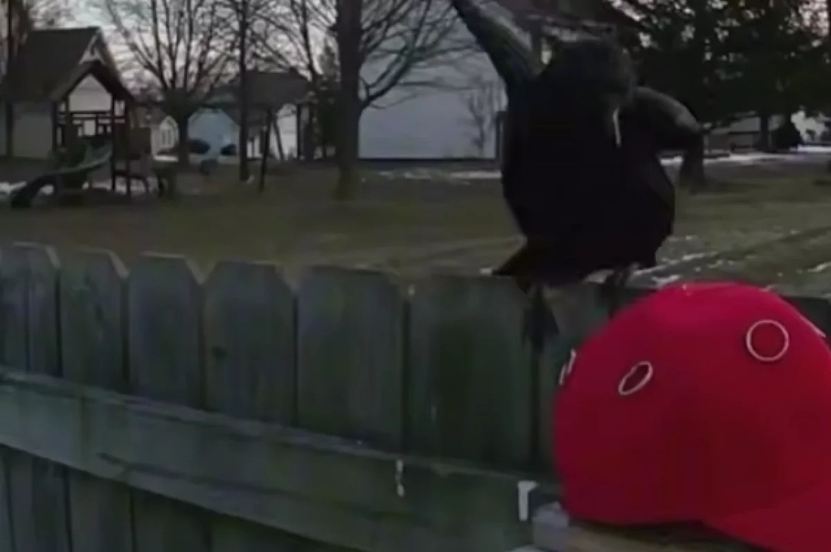 На распространенном в соцсетях видео ворона подлетает к красной кепке, которая лежит на кормушке у забора. Птица начинает клевать головной убор, пока он не падает. Под кепкой оказывается еда, на которую слетаются другие вороны.