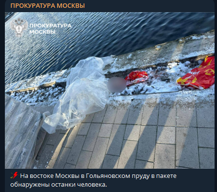 На востоке Москвы в Гольяновском пруду в пакете обнаружены останки человека. На месте работу правоохранительных органов координирует Преображенский межрайонный прокурор Всеволод Ситников. Установление всех обстоятельств и принятие по данному факту процессуального решения на контроле в прокуратуре,